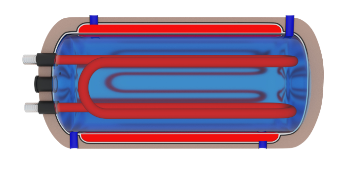 Poziomy wymiennik z płaszczem i wężownicą umożliwia podłączenie dwóch źródeł ciepła oraz grzałki elektrycznej (5/4").