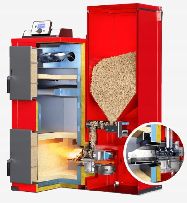 Mimo kompaktowej budowy, kocioł posiada obszerny zasobnik paliwa, bardzo wysoką sprawność dochodzącą do 94% oraz szereg funkcji poprawiających komfort obsługi kotła.